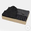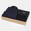 A woollen beanie hat and matching scarf set presented in a luxury gift box.
